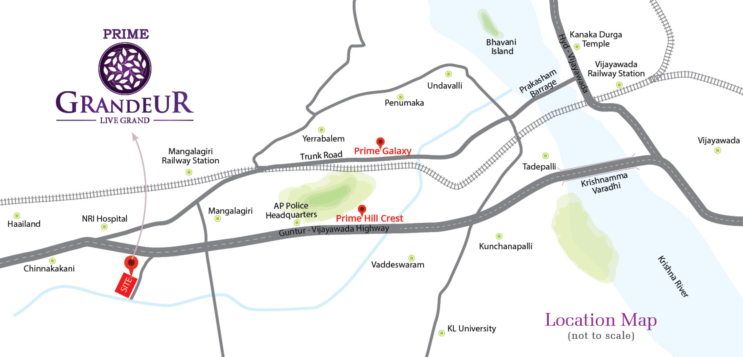Prime Grandeur - Location Map Mangalagiri - 3.5 km. Amaravathi Township - 4.5 km. KL University - 11 km. Nagarjuna University - 7 km. Benz Circle - 16 km. AP Police Headquatres - 6.5 km. Haai Land Resorts - 4.5 km. NH 5 - 1 km.
